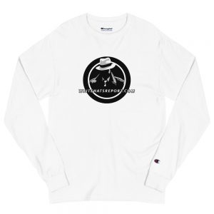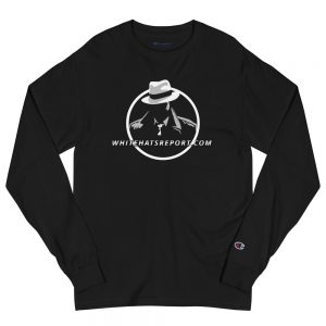 White Hats Report Ultra Premium Champion White Long Sleeve Shirt – with logo and URL on left sleeve